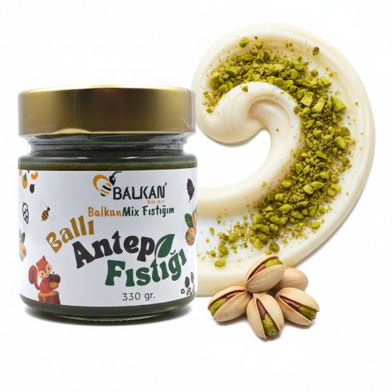 Doğal ham bal ve Antep fıstığı ile hazırlanan 330 gr özel ballı karışım. Katkısız içerik, yoğun aroma ve eşsiz lezzet Balkan Bal Evi’nde.
