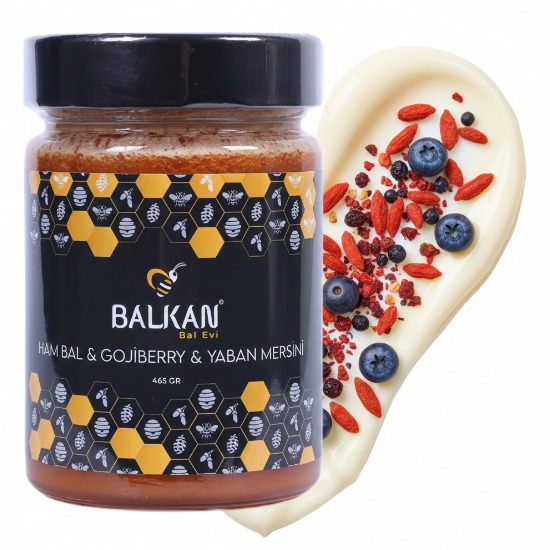 Doğal ham bal, gojiberry ve yaban mersini ile hazırlanan 465 gr özel ballı karışım. Katkısız içerik ve yoğun aroma Balkan Bal Evi’nde.